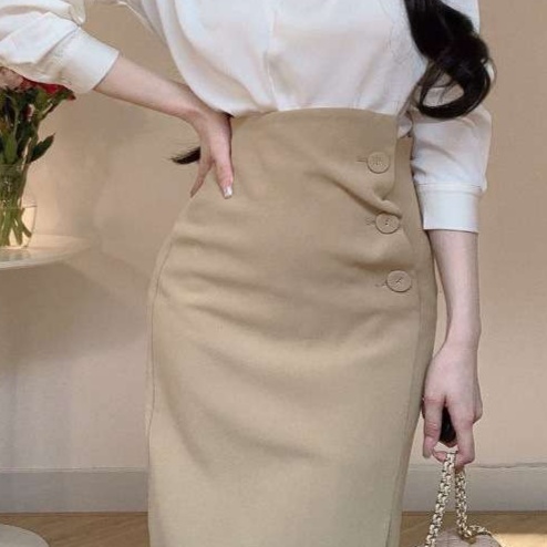 サイドにあしらわれたボタンがアクセントになった、スタイリッシュなベージュのタイトスカートです。
