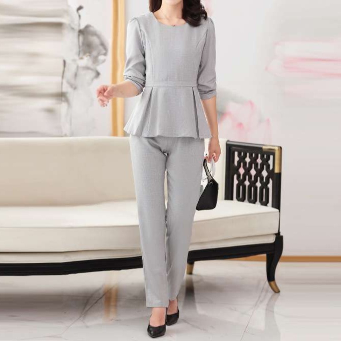 オフィス対応カジュアルなワンピース風ペプラムセットアップでスーツの代わりに