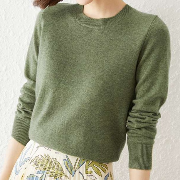 オフィスカジュアルに欠かせない、シンプルで洗練されたデザインの丸首ニットです。