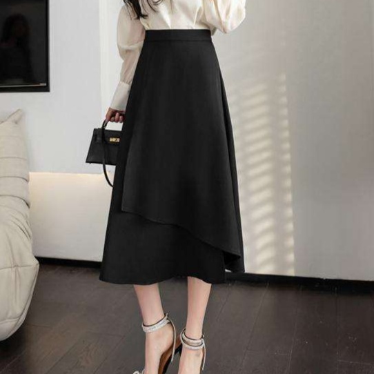重ね着風のデザインが特徴的な黒のレイヤードスカートです。