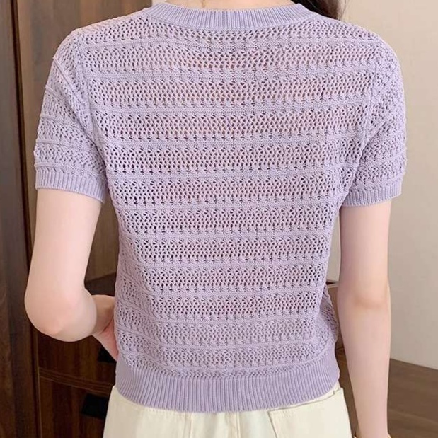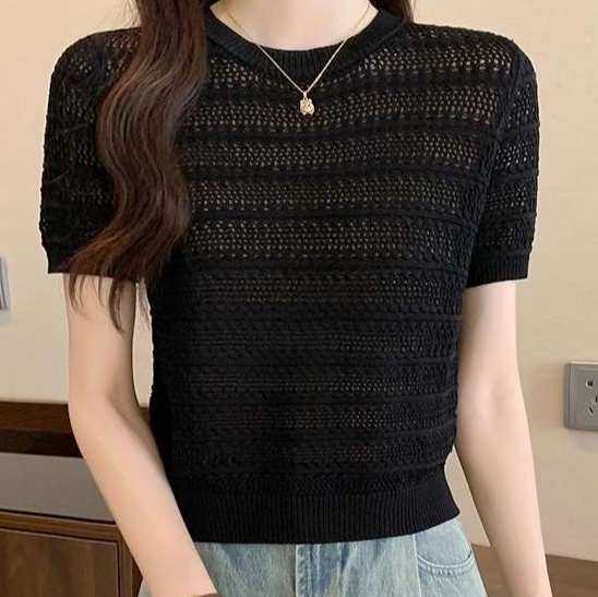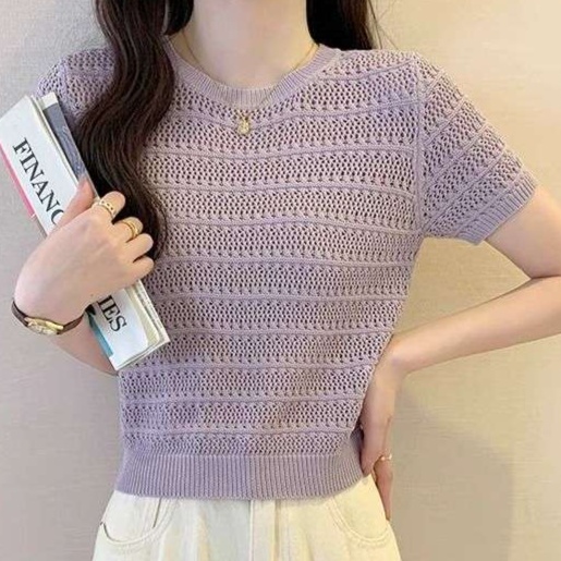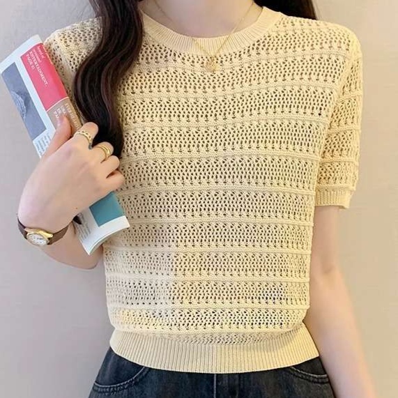 繊細な透かし編みが特徴的な半袖ニット。コンパクトな丈感でハイウエストボトムとの相性抜群。オフィスカジュアルにぴったりな上品さと、カジュアルな雰囲気を両立したデザイン。軽やかな着心地で季節の変わり目にも活躍します。