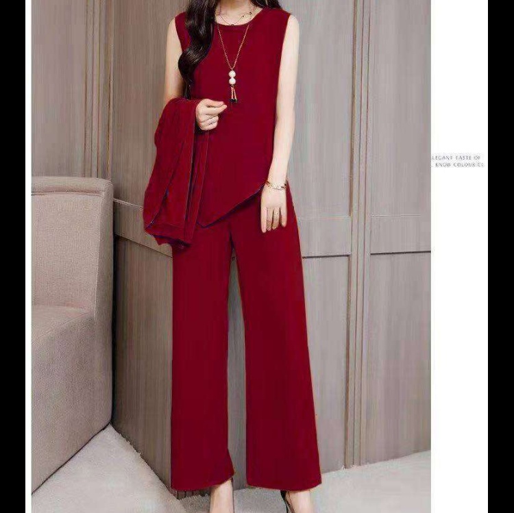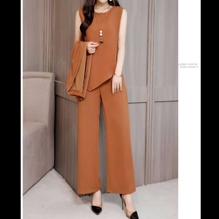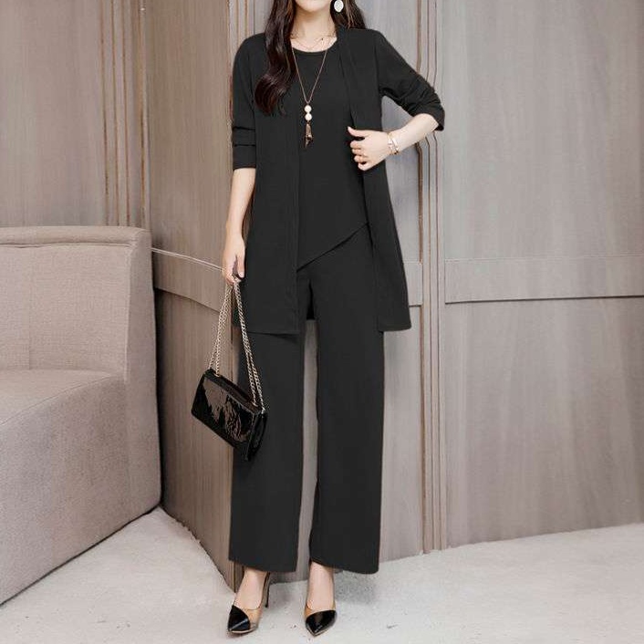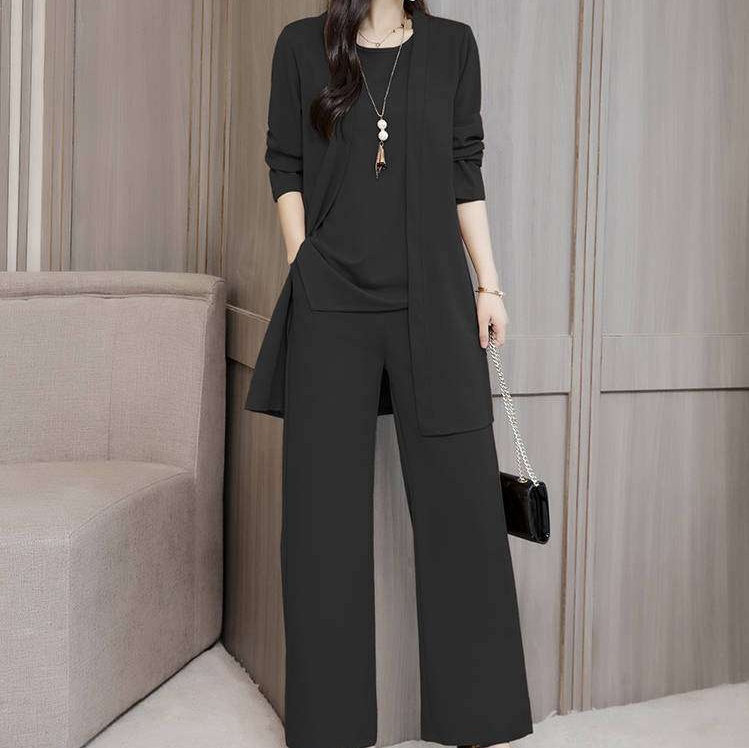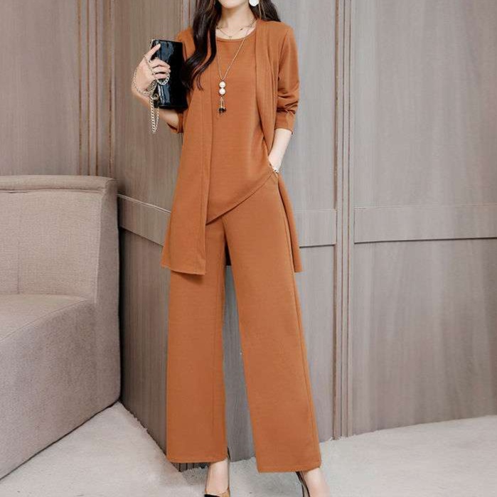 洗練されたデザインのワイドパンツと長めの羽織のセットアップ。上品な雰囲気と快適な着心地を両立。オフィスや特別な場面に適した、女性らしさを引き立てる一着。アクセサリーとの相性も抜群。