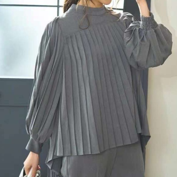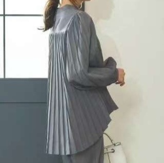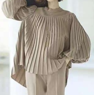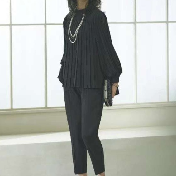 ゆったりとした立体的なプリーツブラウスと、すっきりとしたシルエットのパンツのセットアップ。柔らかな素材感で快適な着心地を提供しつつ、洗練された印象を演出。オフィスからお出かけまで幅広く活用できる上品な大人のスタイル。