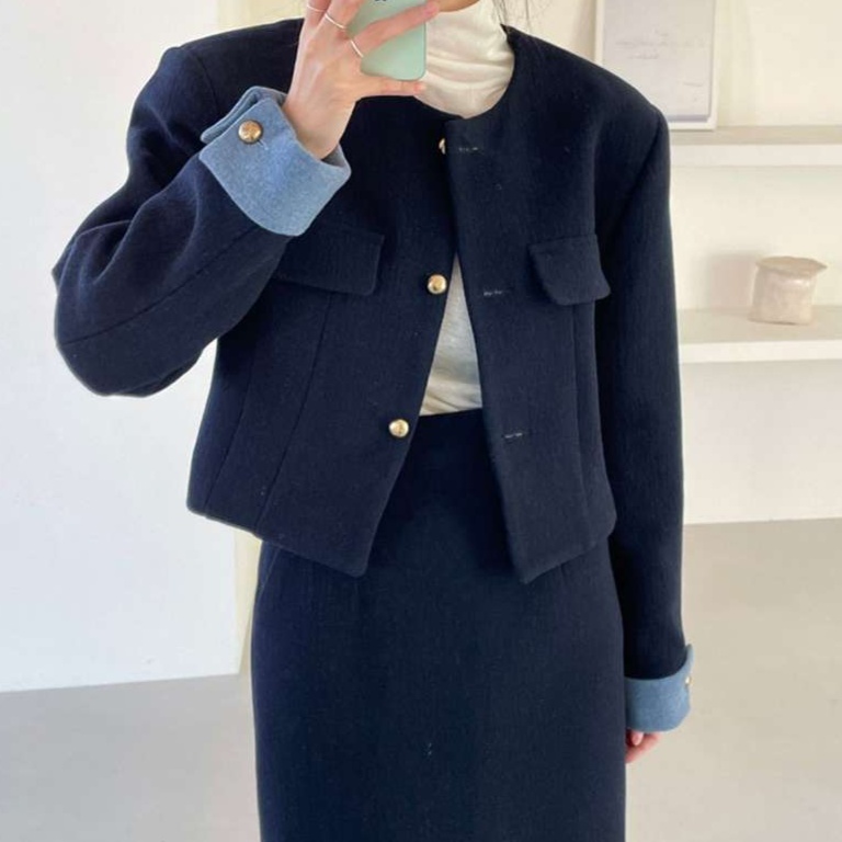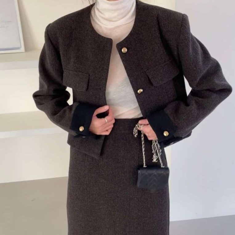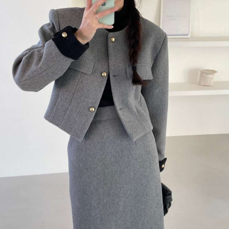 上品な雰囲気のテーラードジャケットとタイトスカートのセット。ジャケットは襟元のデザインと金ボタンが特徴的。スカートはシンプルなタイトシルエット。オフィスや formal な場面に最適な、洗練された印象のスーツです。