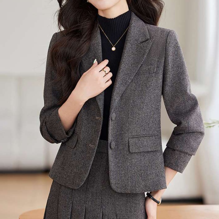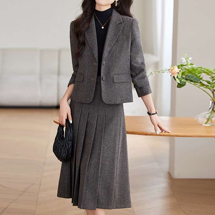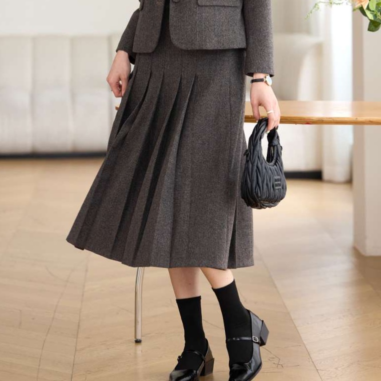洗練されたシルエットの上品なセットアップ。ジャケットは一つボタンで、スカートはプリーツ加工でエレガント。オフィスや外出先でも着回せる優秀アイテム。高級感あるツイード調素材を使用。