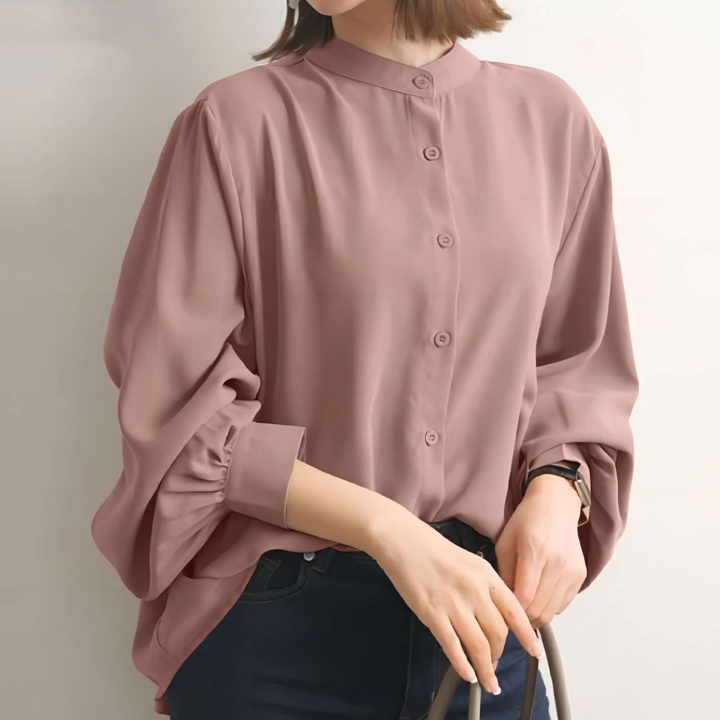 上品な光沢感のある生地を使用した、ドロップショルダーデザインのブラウス。ボタンダウンの前開きで、袖口にはギャザーを寄せたエレガントなデザイン。オフィスや外出時に最適な一着。