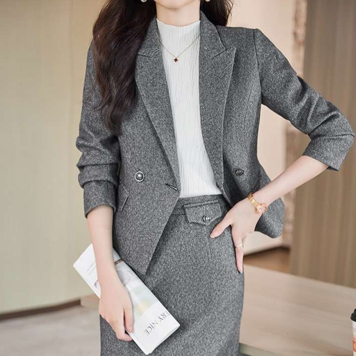洗練されたシルエットのジャケットとスカートのセットアップ。上品な襟元と二つボタンのデザインが特徴。オフィスからフォーマルな場面まで幅広く活躍する、大人の女性にふさわしい一着。
