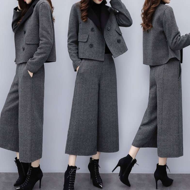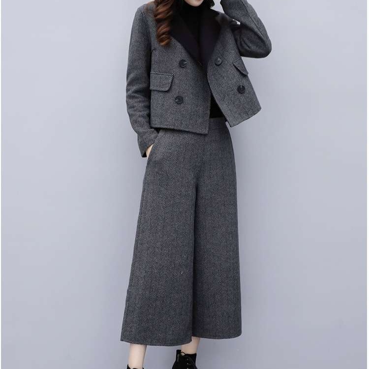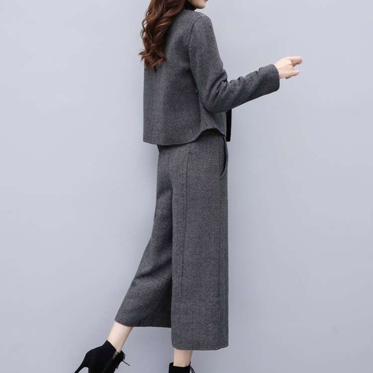 上品な雰囲気のツイード素材を使用したジャケットとワイドパンツのセットアップ。シンプルながら洗練された印象で、オフィスからお出かけまで幅広く活躍。ハイネックトップスと合わせてクラシカルな雰囲気に。