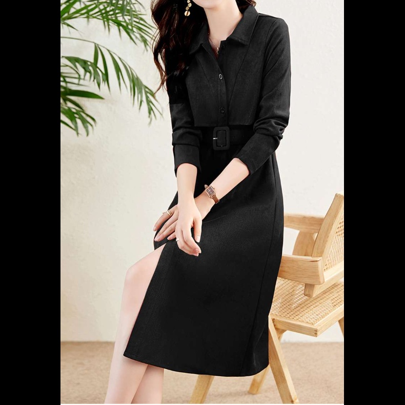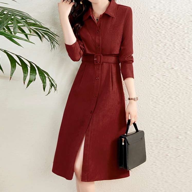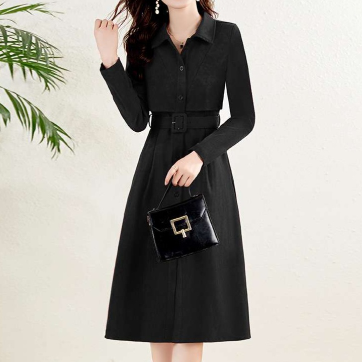上品な襟元と細身のシルエットが特徴的なシャツワンピース。ウエストのベルトでスタイルアップ効果も。オフィスからお出かけまで幅広く活躍する一着。長袖で季節を問わず着用可能。