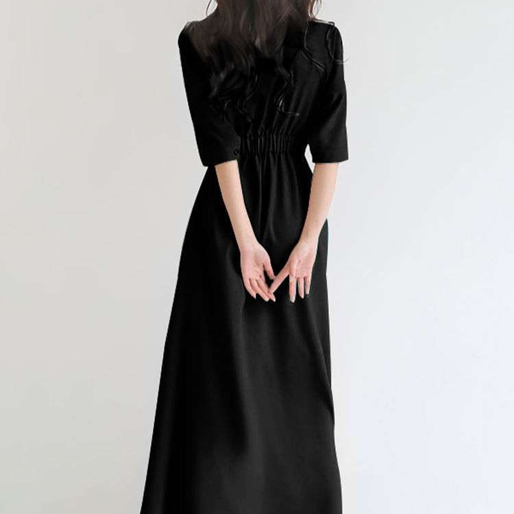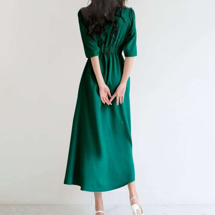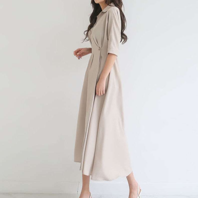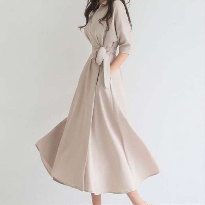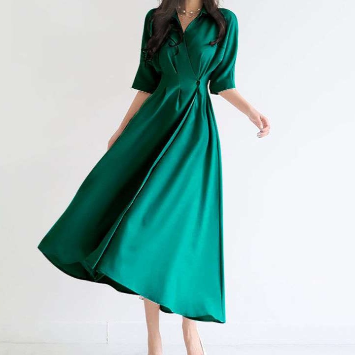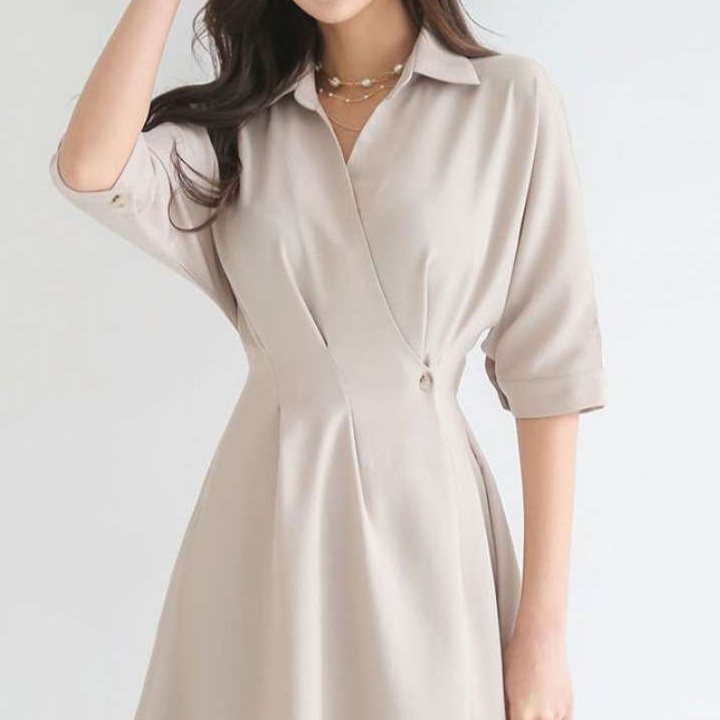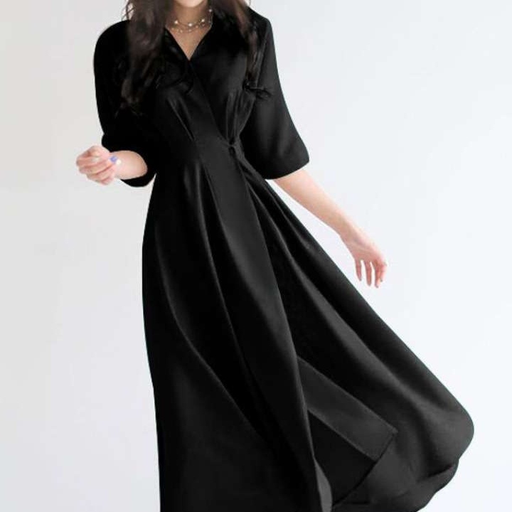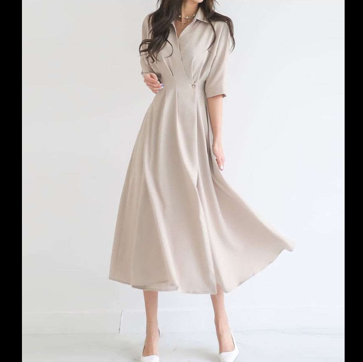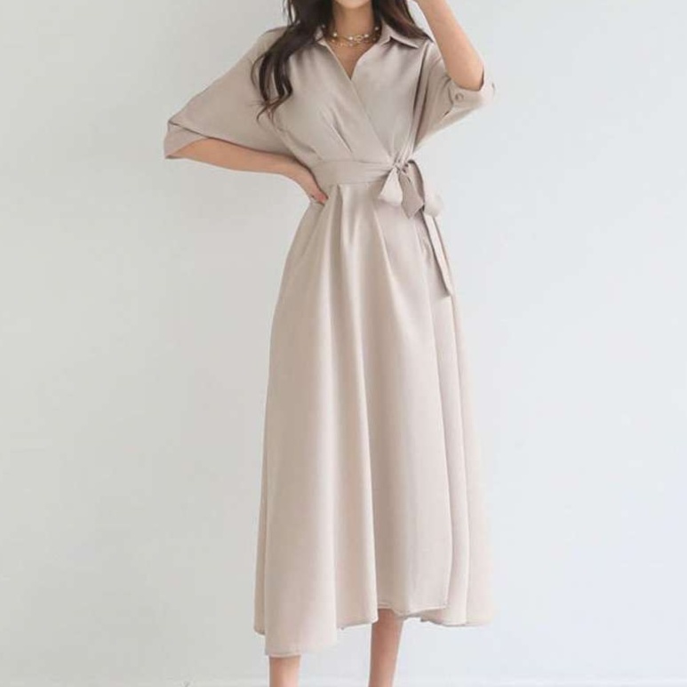 襟付きのラップデザインで上品な印象。ウエストのリボンで体型カバーも。七分袖で季節を選ばず、オフィスからお出かけまで幅広く活躍する大人の女性向けワンピース。