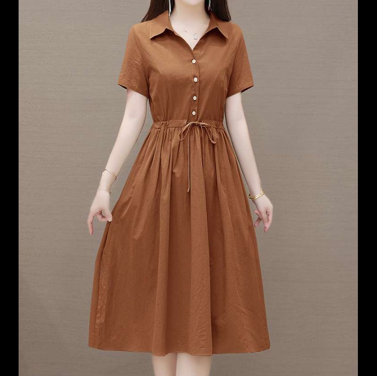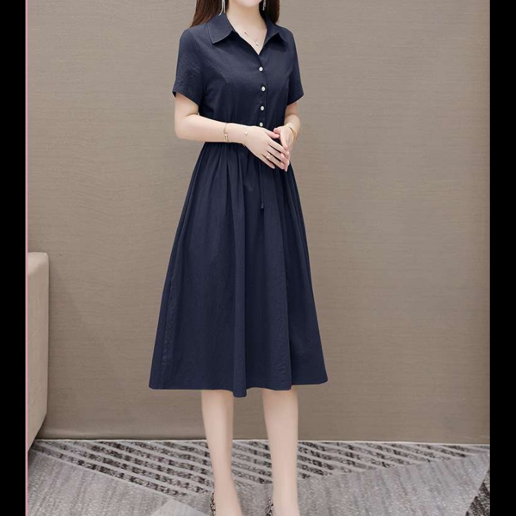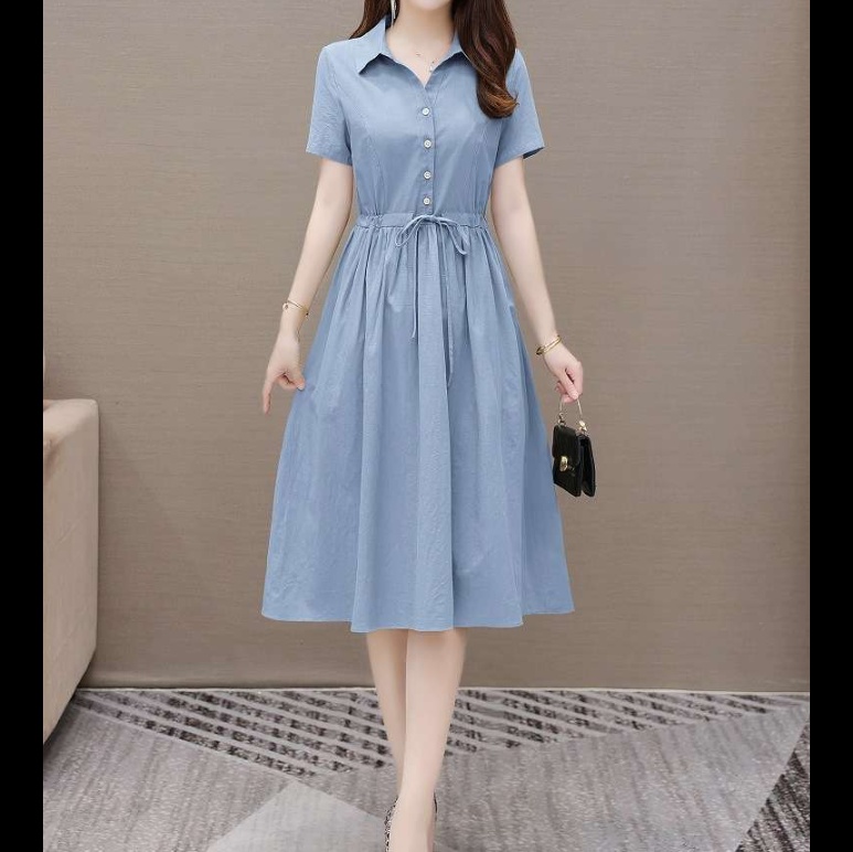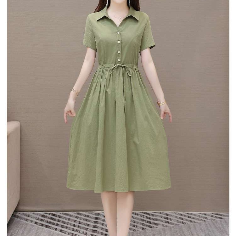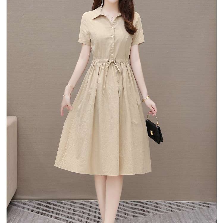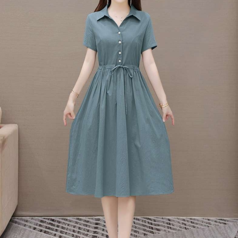 襟付きのデザインと締めつけ感のない優雅なAラインシルエットが特徴的。ウエストのリボンで体型をカバーしつつ、女性らしいラインを演出。オフィスや外出時に最適な上品な一着。