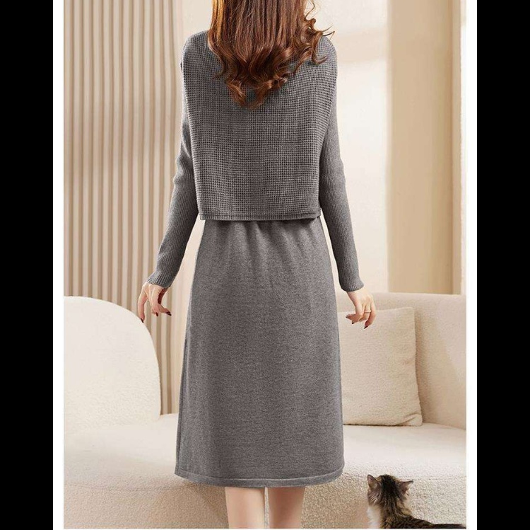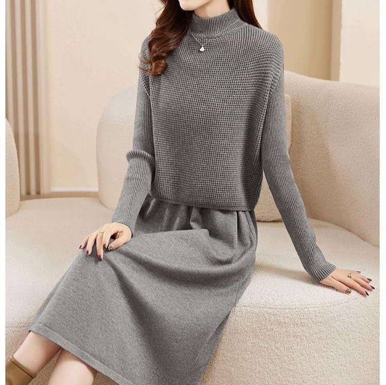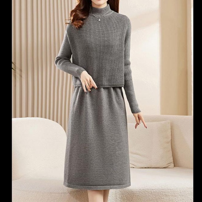 モックネックのニットトップスと上品なスカートを組み合わせた2ピース風デザイン。ウエストのメリハリが女性らしいシルエットを演出。オフィスからお出かけまで幅広く活用できる、大人の洗練ワンピース。