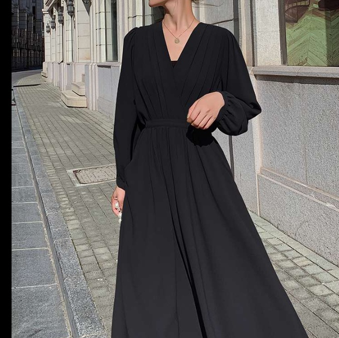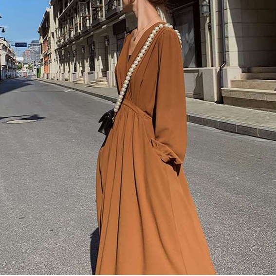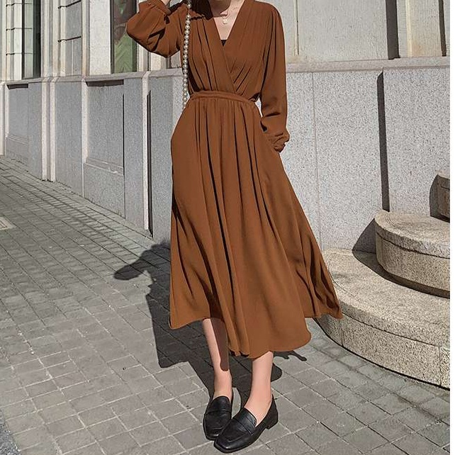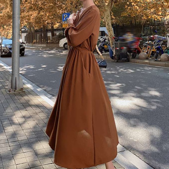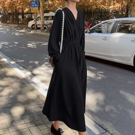 しなやかな生地感と上品なデザインが特徴のワンピース。深めのVネックと長めの丈で大人の女性らしさを演出。オフィスからお出かけまで幅広く活躍する一枚。ウエストのギャザーがスタイルアップ効果を高めます。