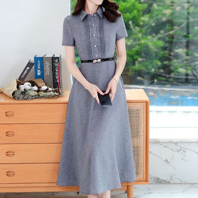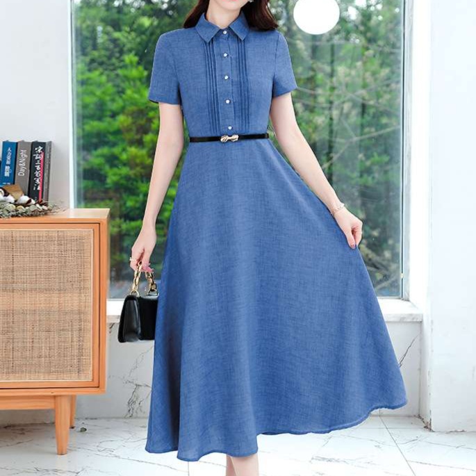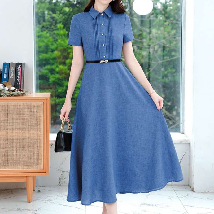 オフィスカジュアル レディースにぴったりの上品なシャツワンピース。デニムライクな生地感で、ブルーとグレーの2色展開。ベルト付きでウエストマークし、女性らしいシルエットを演出。清楚で知的な印象を与える一着です。