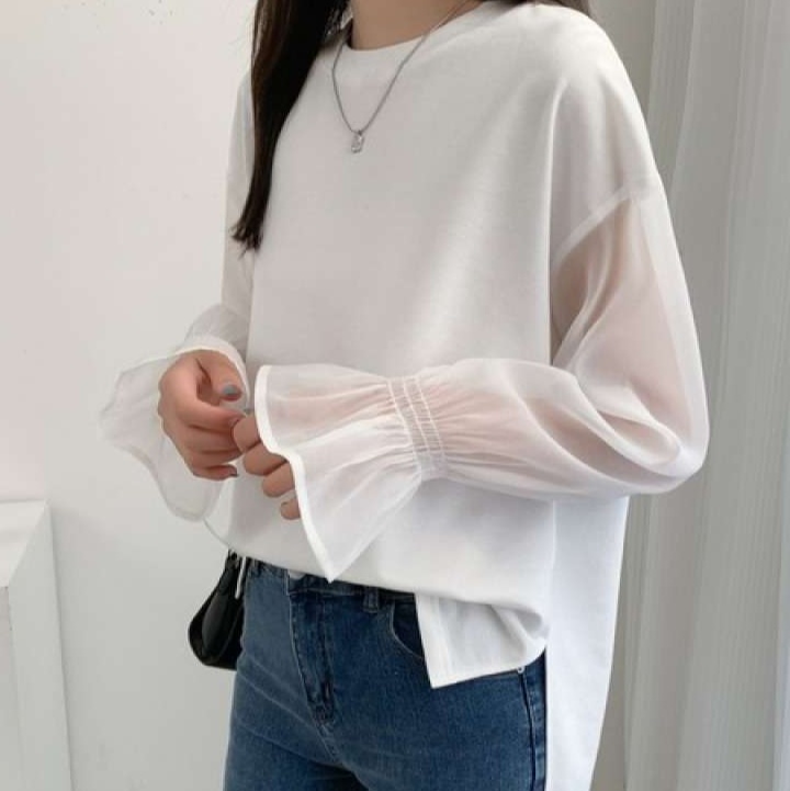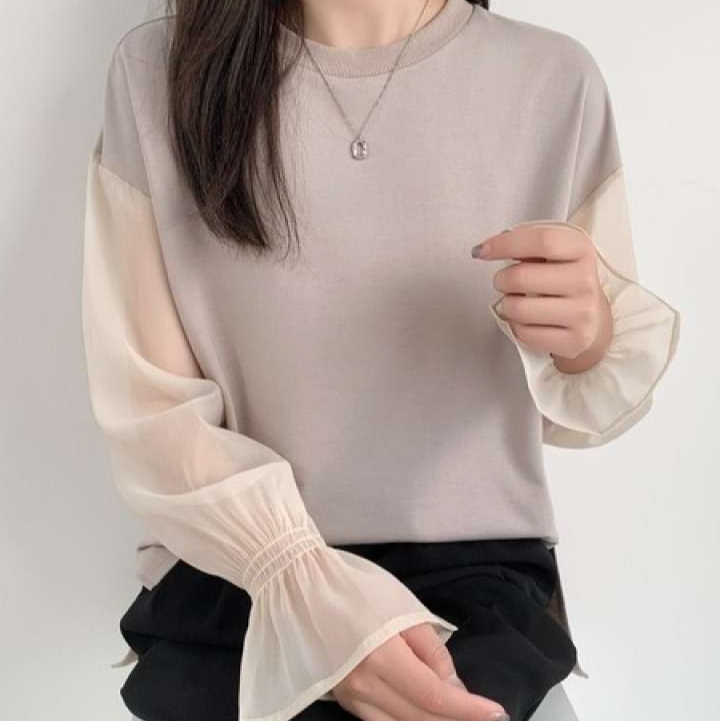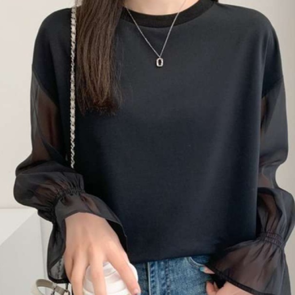 黒のスウェット生地にシースルーの袖を組み合わせた、エレガントなオフィスカジュアルトップス。袖口のフリルデザインがフェミニンな印象を与え、シンプルなデニムと合わせやすい洗練されたアイテムです。首元のネックレスが映える、大人の女性らしい一着。