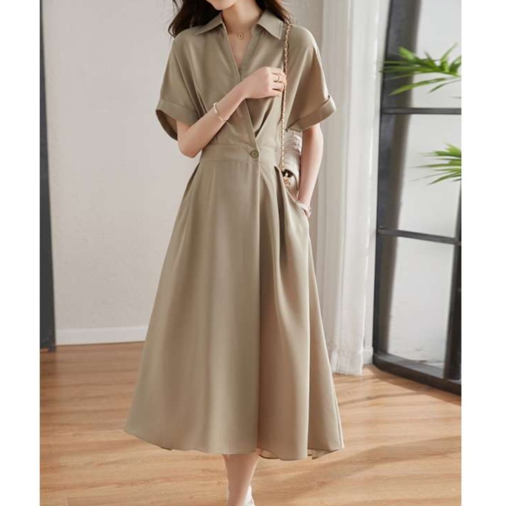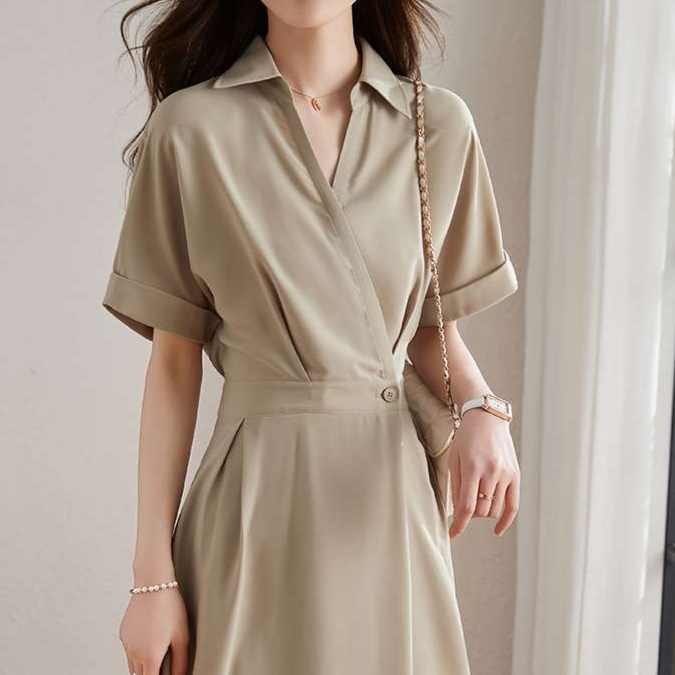 ベージュのシンプルなデザインで上品さと機能性を兼ね備えたワンピース。ウエストマークと膝下丈のAラインシルエットで女性らしさを演出。オフィスや様々なシーンで活躍する一枚です。
