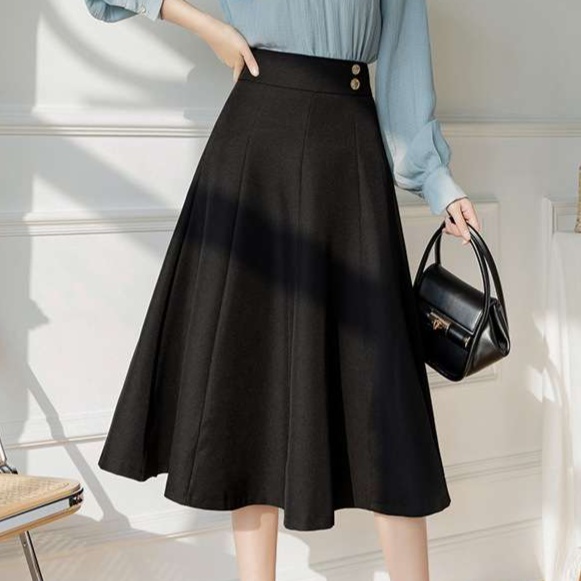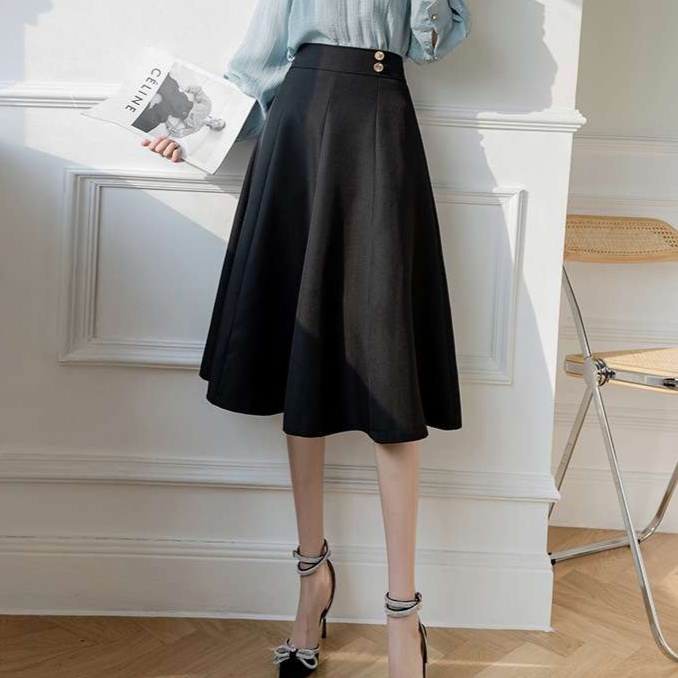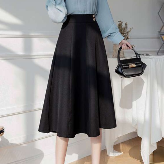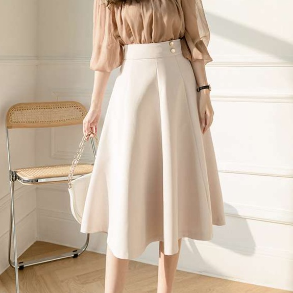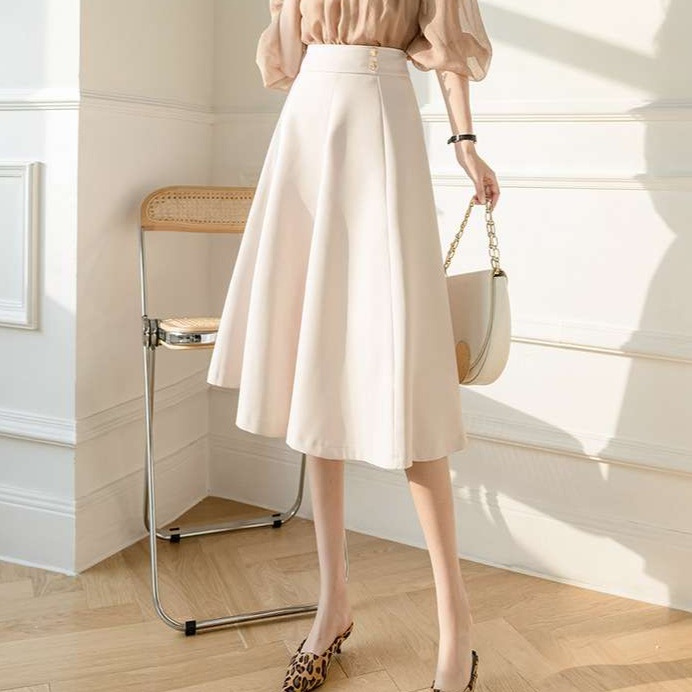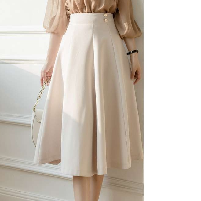 オフィスにぴったりの上品なAラインスカート。ハイウエストデザインで脚長効果抜群。ベージュと黒の2色展開で、様々なトップスと相性抜群。きれいめカジュアルからフォーマルまで幅広く活躍する一枚です。