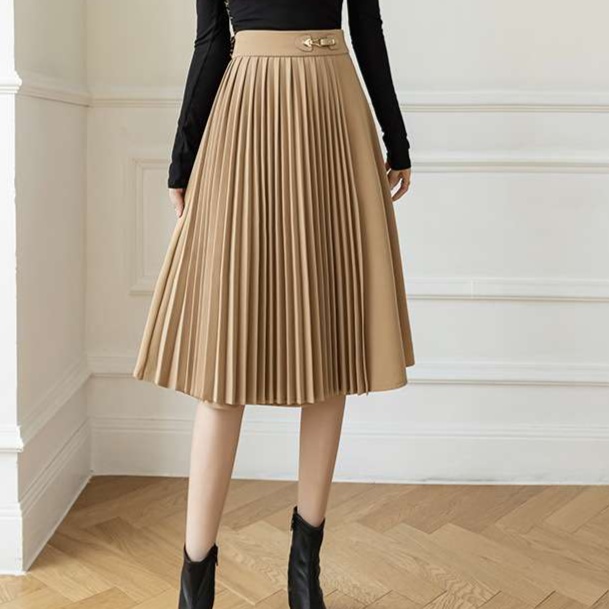 上品な光沢感のあるプリーツデザインが特徴的なミディ丈スカート。ウエストのゴールドバックルがアクセントに。ベージュと黒の2色展開で、オフィスからお出かけまで幅広く活躍する一着です。柔らかな素材感で着心地も抜群。
