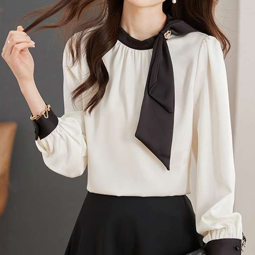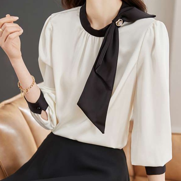 白と黒のコントラストが美しい、オフィスカジュアルにぴったりのブラウス。大きなリボンタイがアクセントとなり、フェミニンな印象を演出。袖口のデザインと素材感が高級感を醸し出し、ビジネスシーンで洗練された雰囲気を演出します。