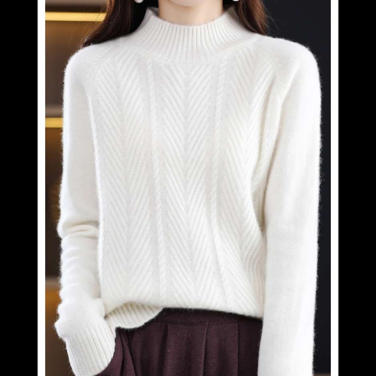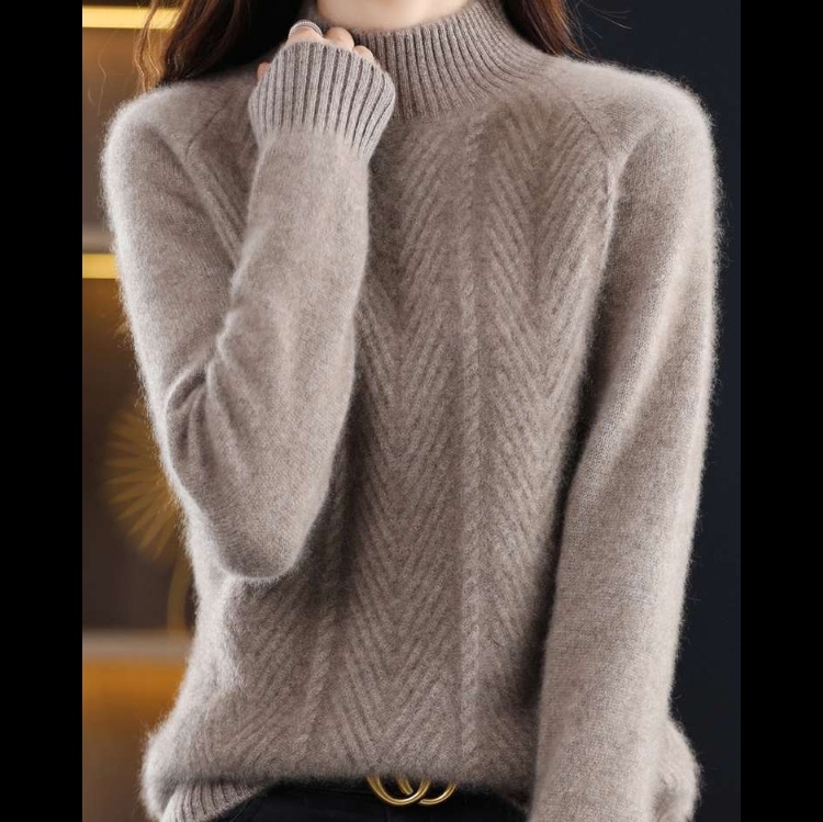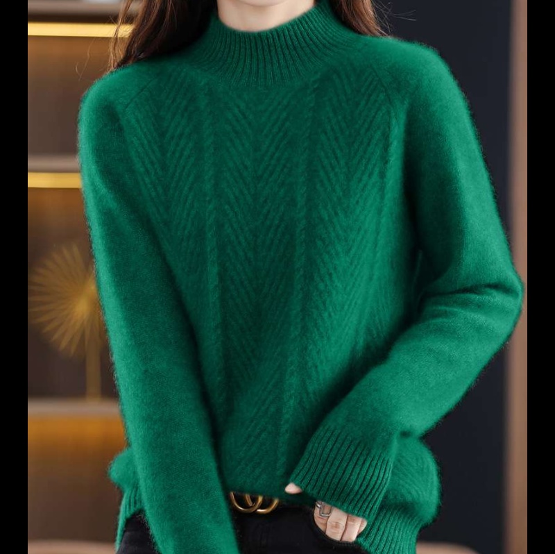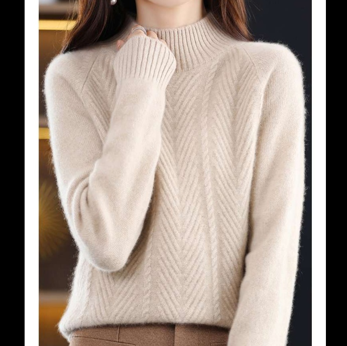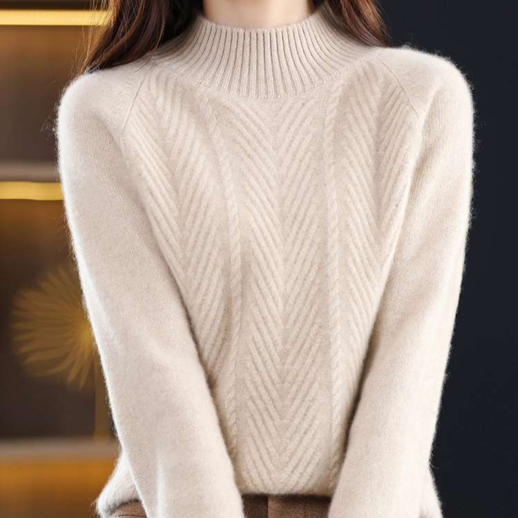 贅沢な素材感と洗練されたデザインが特徴のモックネックニット。胸元のヘリンボーン模様が上品さを演出し、オフィスからカジュアルまで幅広く活躍。ゆったりとしたシルエットで着心地も抜群です。